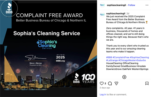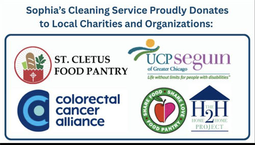 A portion of every cleaning is donated to cancer research and local charities in honor of our founder, Sophia Borek. Call (708) 485-8100 or visit sophiascleaning.com for a free estimate (easy, over-the-phone flat-rate price estimates in minutes).